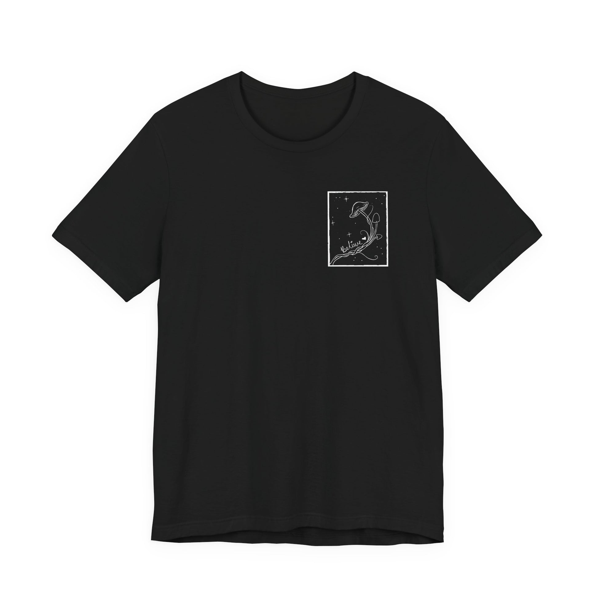This whimsical mushroom T-shirt with the quote 'if you can believe, you can achieve' embodies Cottage core aesthetics and promotes personal growth. The perfect addition to any nature lover's wardrobe, this tee exudes a magical atmosphere and inspires positivity. Ideal for casual wear or layering, it is suitable for those who appreciate nature-inspired designs and believe in the power of positive thinking. Perfect for holidays like Earth Day or everyday wear for individuals embracing a positive mindset.