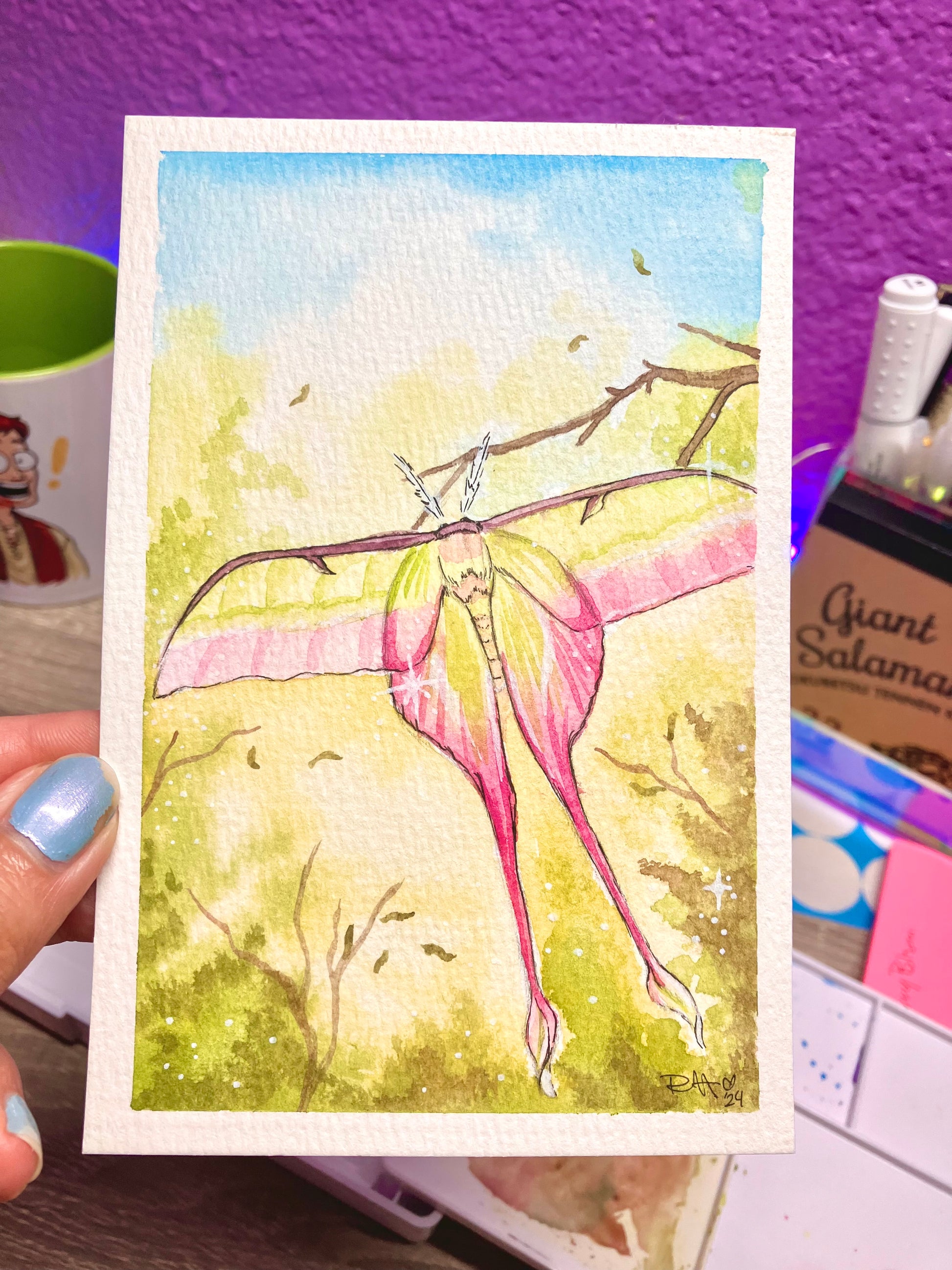 Add a touch of whimsy to your home with this "Enlighten beauty" Chinese lunar moth painting. This 4x6 watercolor masterpiece depicts the majestic moth basking in the warm glow of the sun, highlighting the beauty of nature. A perfect addition to any art collection (or moth enthusiast's wall)!