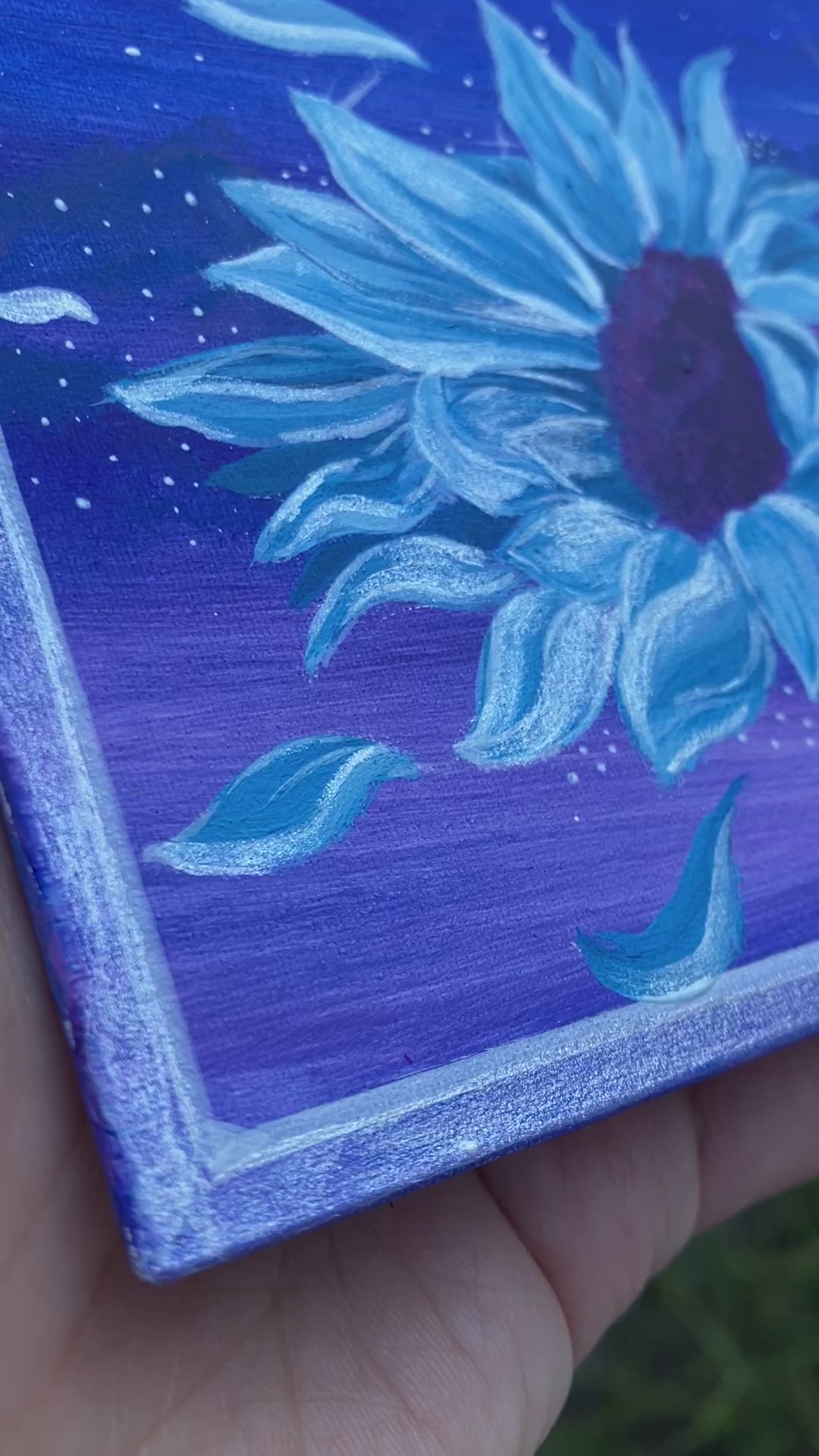 Capture the beauty of a sunflower at dusk with this one-of-a-kind 5x5 hand-painted art piece. Its vibrant acrylic colors evoke the serene feeling of a sunflower field under the dusk sky. Perfect for any art lover looking to add a touch of nature to their space.
